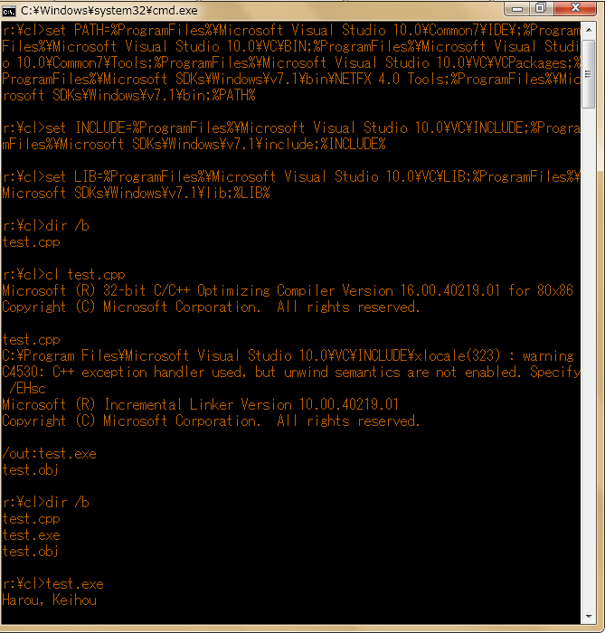 後はコマンドプロンプトでcl.exeコンパイラを起動するというLinuxに