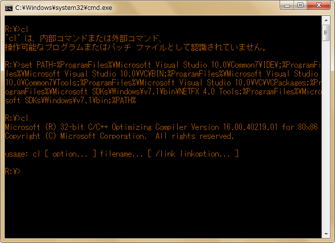 後はコマンドプロンプトでcl.exeコンパイラを起動するというLinuxに